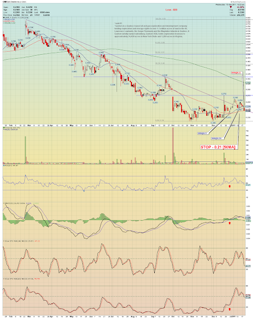Junior nat gas producer. I think the sector has found a bottom, we shall see. Good risk reward but there's a Head and Shoulders pattern in the 60 mins chart. Stop is below the 50 MA. Overall, the markets are extremely overbought, there was a reversal on the SP and TSX today so I will eject some of these names fast if things roll over.